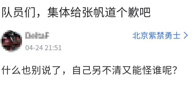 在出局赛后,有不少北京球迷发帖声援张帆,甚至喊话北控全队:集体给张帆道歉吧。