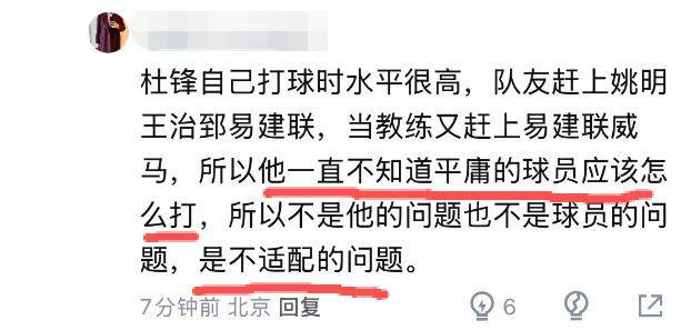此外,还有部分球迷阐述了客观事实:“杜锋自己打球时水平很高,队友赶上姚明王治郅易建联,当教练又赶上易建联威马,所以他一直不知道平庸的球员应该怎么打,所以不是他的问题也不是球员的问题,是不适配的问题。”
