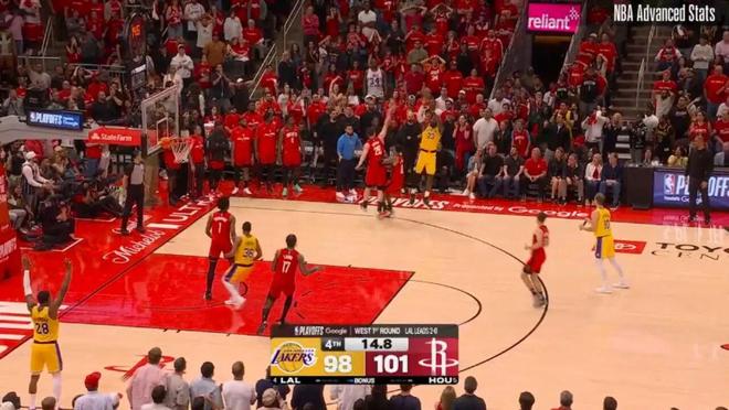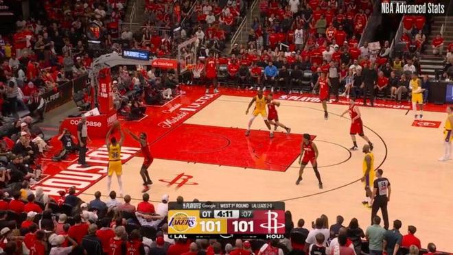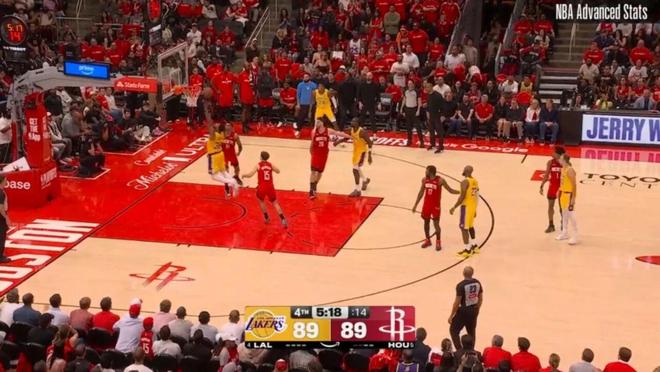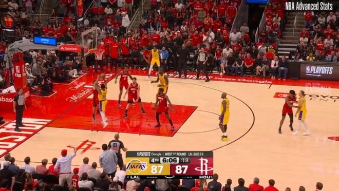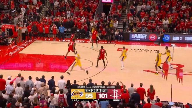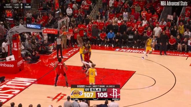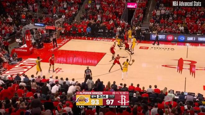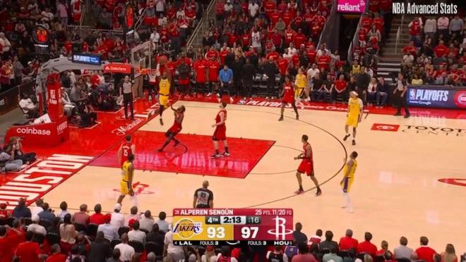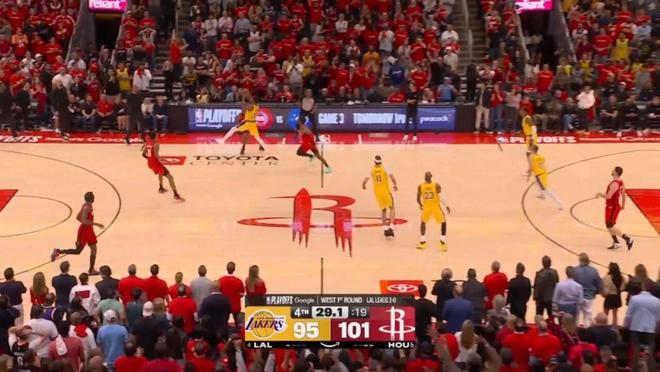 ——剩下2分钟前,湖人93-97火箭,斯马特与詹姆斯连线,助攻詹姆斯完成空接