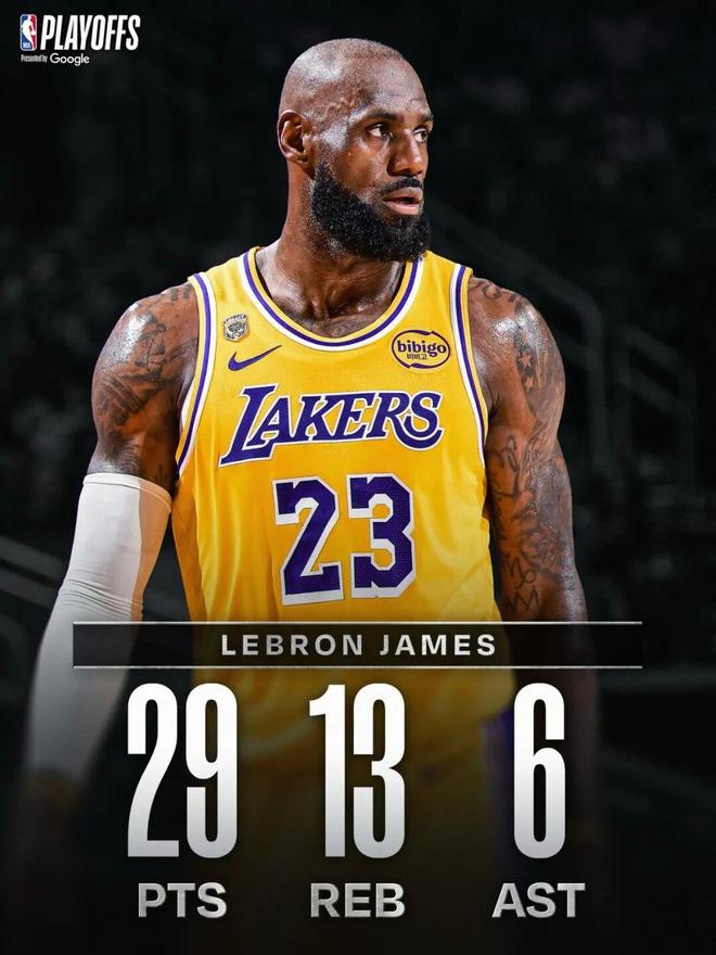 这场比赛,41岁的詹姆斯打出了非常不可思议的表现:全场出战45分钟,投篮22中10,三分9中4,罚球6中5,得到29分13篮板6助攻3抢断1盖帽。
