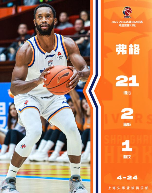 CBA常规赛最终轮,上海男篮94-88击败山东男篮豪取23连胜,这场比赛上海男篮依旧在洛夫顿、怀特塞德缺席的情况下拿到胜利。弗格29分钟拿到21分2篮板1助攻,古德温32分钟拿到15分9助攻7篮板,替补席的李添荣29分钟拿到19分5篮板。