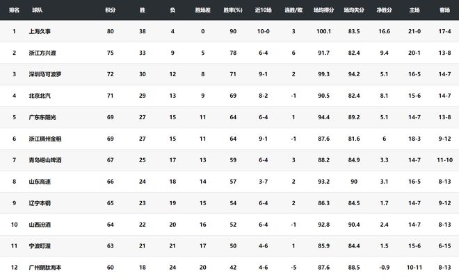 上海38胜4负、广厦33胜9负、深圳30胜12负、北京29胜13负、广东27胜15负、浙江27胜15负、青岛25胜17负、山东24胜18负、辽宁23胜19负、山西22胜20负、宁波21胜21负、广州18胜24负。