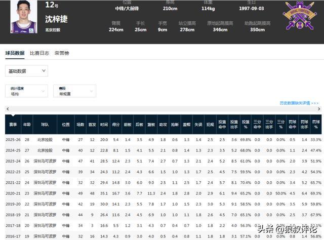 但在25-26赛季,沈梓捷代表北控出战27场比赛,场均20分钟,得到5.4分4.9篮板1.3封盖,投篮命中率为69.8%,在场场均只有3.6次出手,创造生涯菜鸟赛季外的新低。