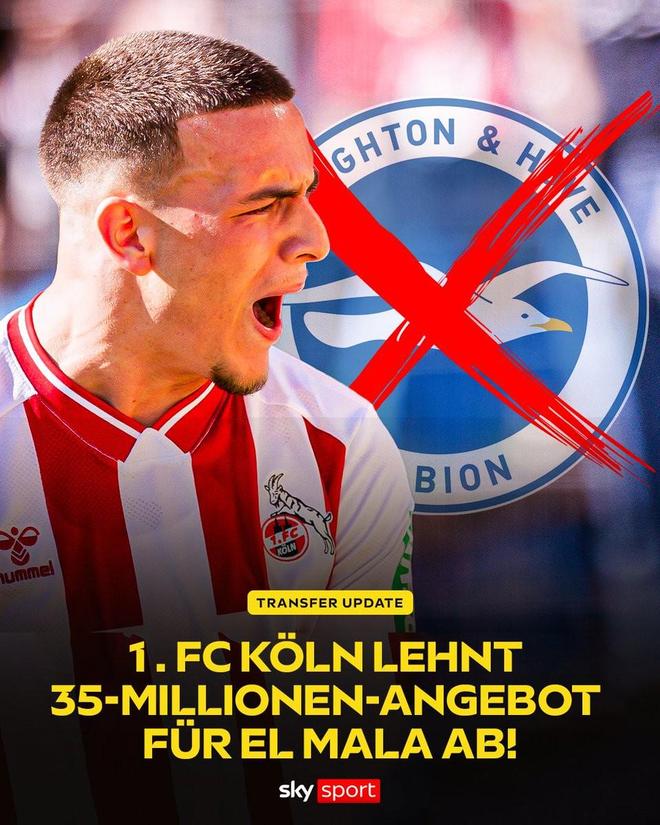 根据德国天空体育的最新消息,科隆拒绝了布莱顿对马拉开出的3500万欧元报价,俱乐部已为这名19岁小将定下5000万欧元的标价。